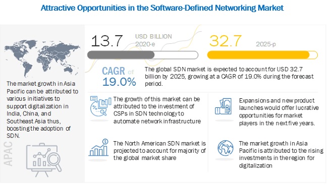 소프트웨어 정의 네트워크(SDN;Software Defined Network) 시장이 2020년부터 2025년까지 19%의 연평균복합성장률을 기록할 것이라는 예측이 나왔다. 이에 따라 SDN 시장 규모가 2020년 137억 달러에서 20205년에 327억 달러에 달할 전망이다.