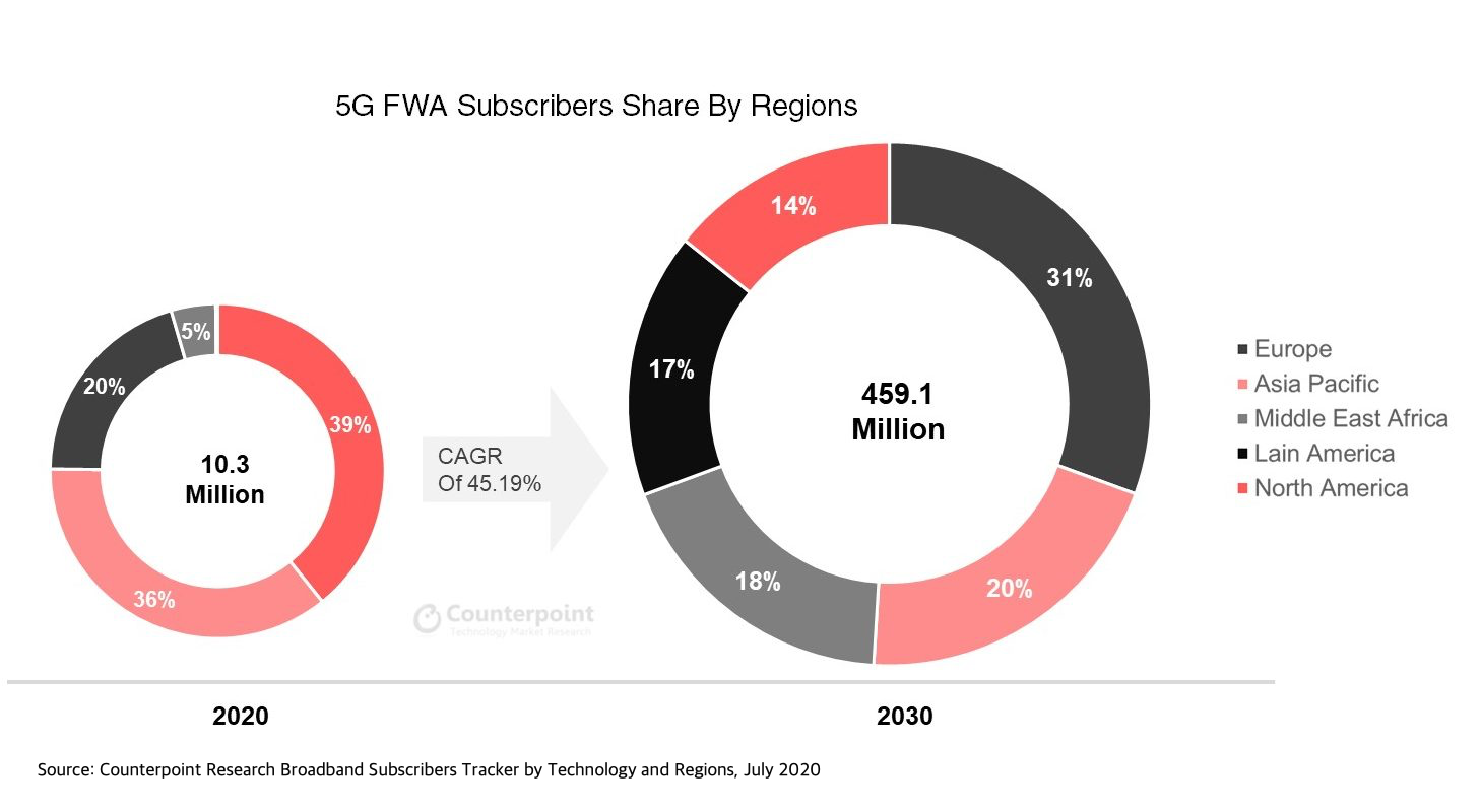 2030년에는 전 세계 가정에서 인터넷에 접속하는 가구의 1/3이, 유선이 아닌 무선 네트워크를 이용하게 될 전망이다. 카운터포인트리서치가 '2030년까지 FWA 시장 전망 보고서(Global Household FWA Subscribers to Cross Half a Billion Mark by 2030)’를 발표하고, 현재 4%에 불과한 무선 기반 광대역 접속이 2030년에는 약 5억 명의 가입자를 확보할 것이라고 예측했다.