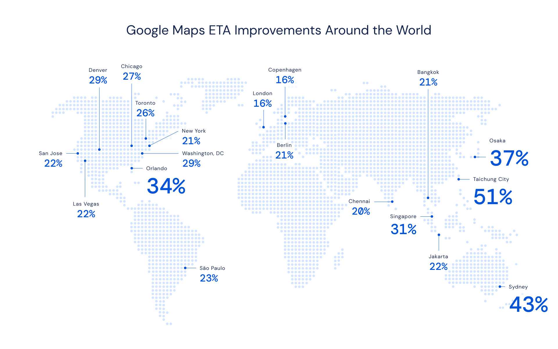 아울러 코로나19(COVID-19)가 구글 지도의 교통 정보 예측에까지 영향을 끼쳤다는 점도 공개했다. 코로나19(COVID-19)가 빠르게 확산하면서, 강도 높은 사회적 거리두기나 봉쇄 조치를 내리는 나라가 많아졌다. 이렇게 코로나19가 확산하면서 전 세계 교통량은 최대 50%가 감소했다.