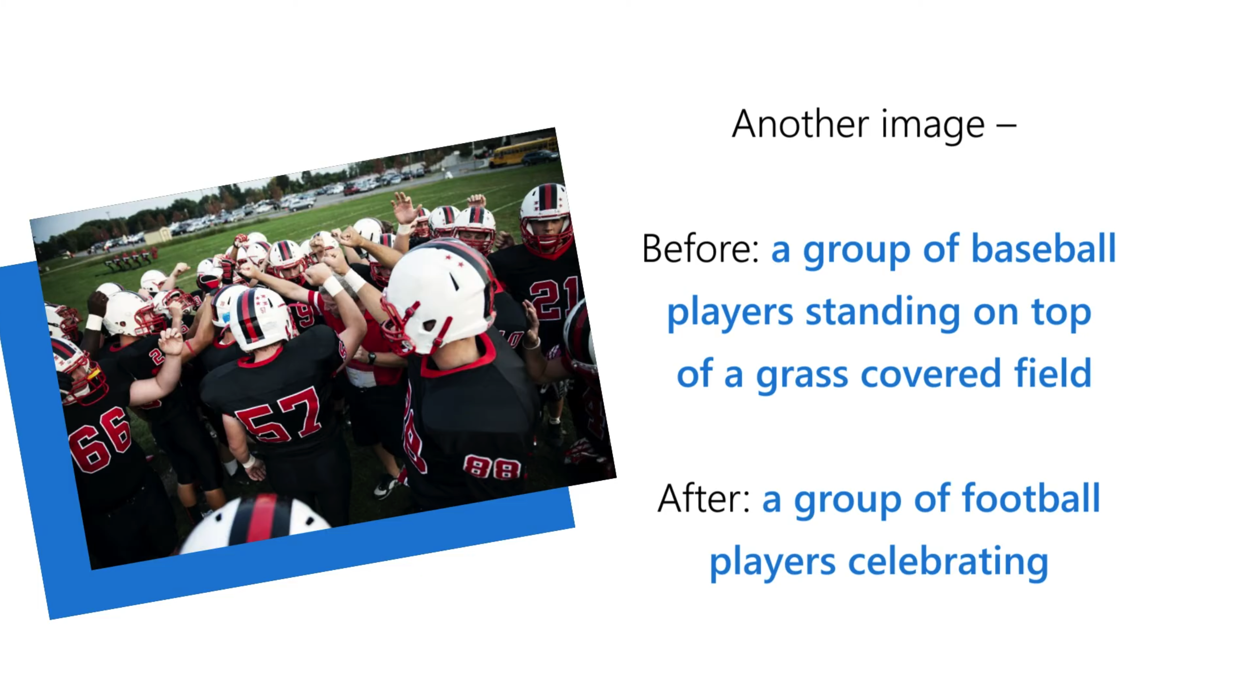 마이크로소프트는 "자동 이미지 캡션을 사용하면 검색 결과로 반환된 사진부터 프레젠테이션에 포함된 이미지에 이르기까지, 모든 이미지의 중요한 콘텐츠에 액세스할 수 있다. 이번에 공개한 연구를 통해 이러한 결과를 개선할 수 있지만, 시스템이 매번 완벽한 결과를 반환한다는 의미는 아니다”라고 밝혔다. 이전보다 자동 캡션 기능의 성능이 향상된 것은 맞지만 때로는 기대에 못 미치는 경우도 있다는 의미다.