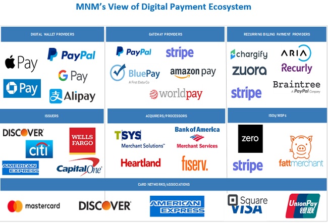 세부 분야별로 보면 1,000명 이상의 직원을 가진 대기업, 디지털 결제 지갑 솔루션, 디지털 결제 전문 서비스가 상대적으로 높은 성장세를 보일 것으로 예측했다. 지역으로는 아태지역이 가장 높은 성장률을 기록할 것으로 추정했다. 디지털 결제 시장에 진출해 있는 주요 업체로 미국의 ACI 월드와이드, 애플 페이(Apple Pay), 듀(Due), 글로벌 페이먼츠(Global Payments), JP모건 채이스(JPMorgan Chase), 마스터카드, 페이팔(PayPal), 비자(VISA), 영국의 페이세이프(Paysafe), 네덜란드의 페이유(PayU), 프랑스의 월드라인(Worldline) 등이 있다.