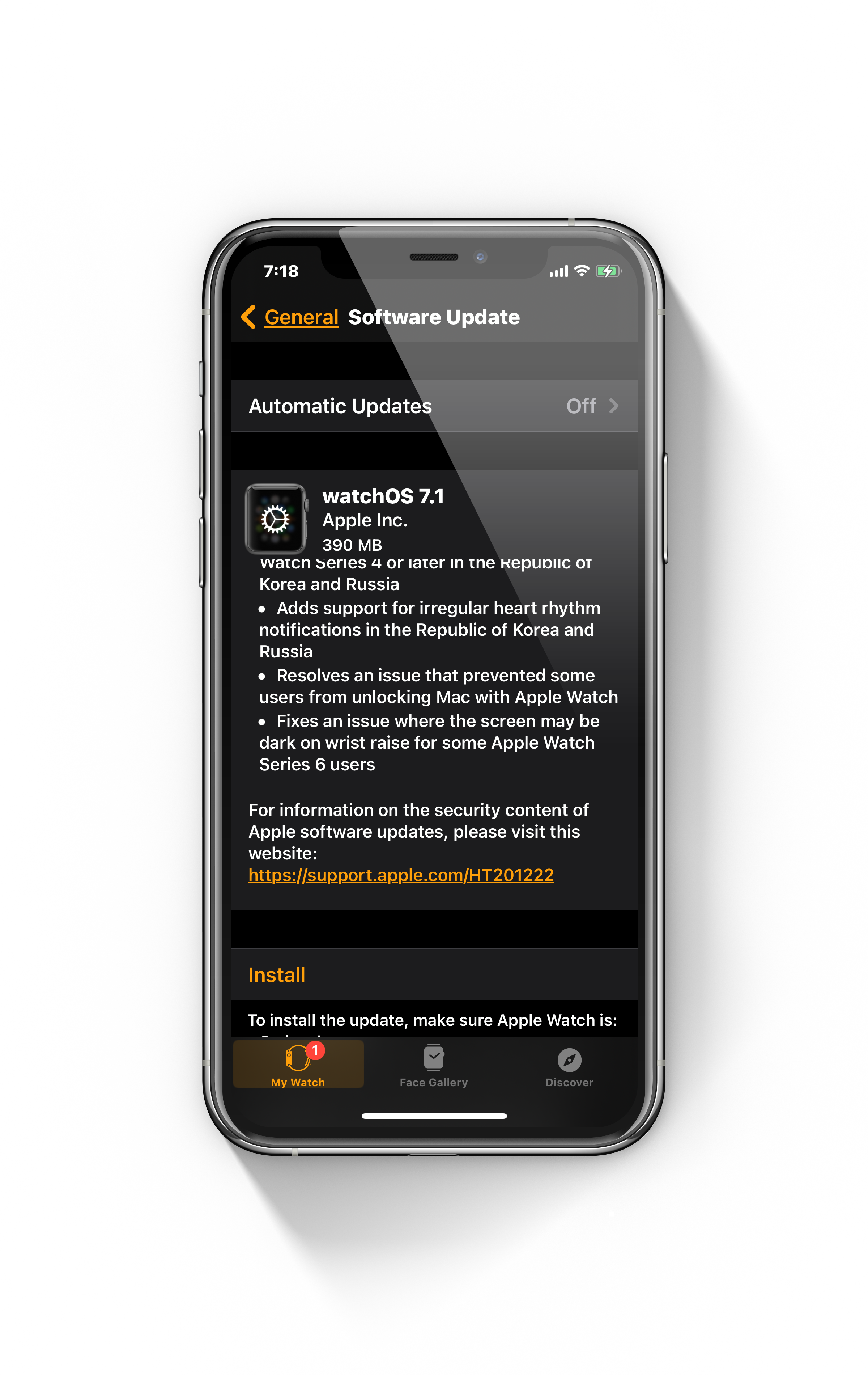한국에서 애플 워치에서 제공하는 심전도(ECG) 기능을 사용하려면, 애플 워치 시리즈 4 이상 모델에 워치OS 7.1 이상을 설치해야 한다. 워치OS 7.1을 업데이트하려면 먼저 아이폰에서 iOS 14.2를 설치