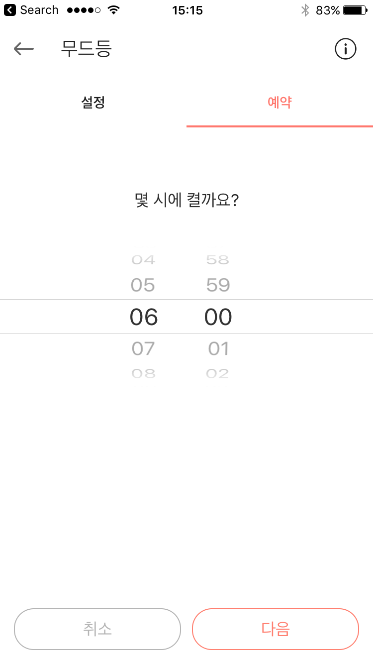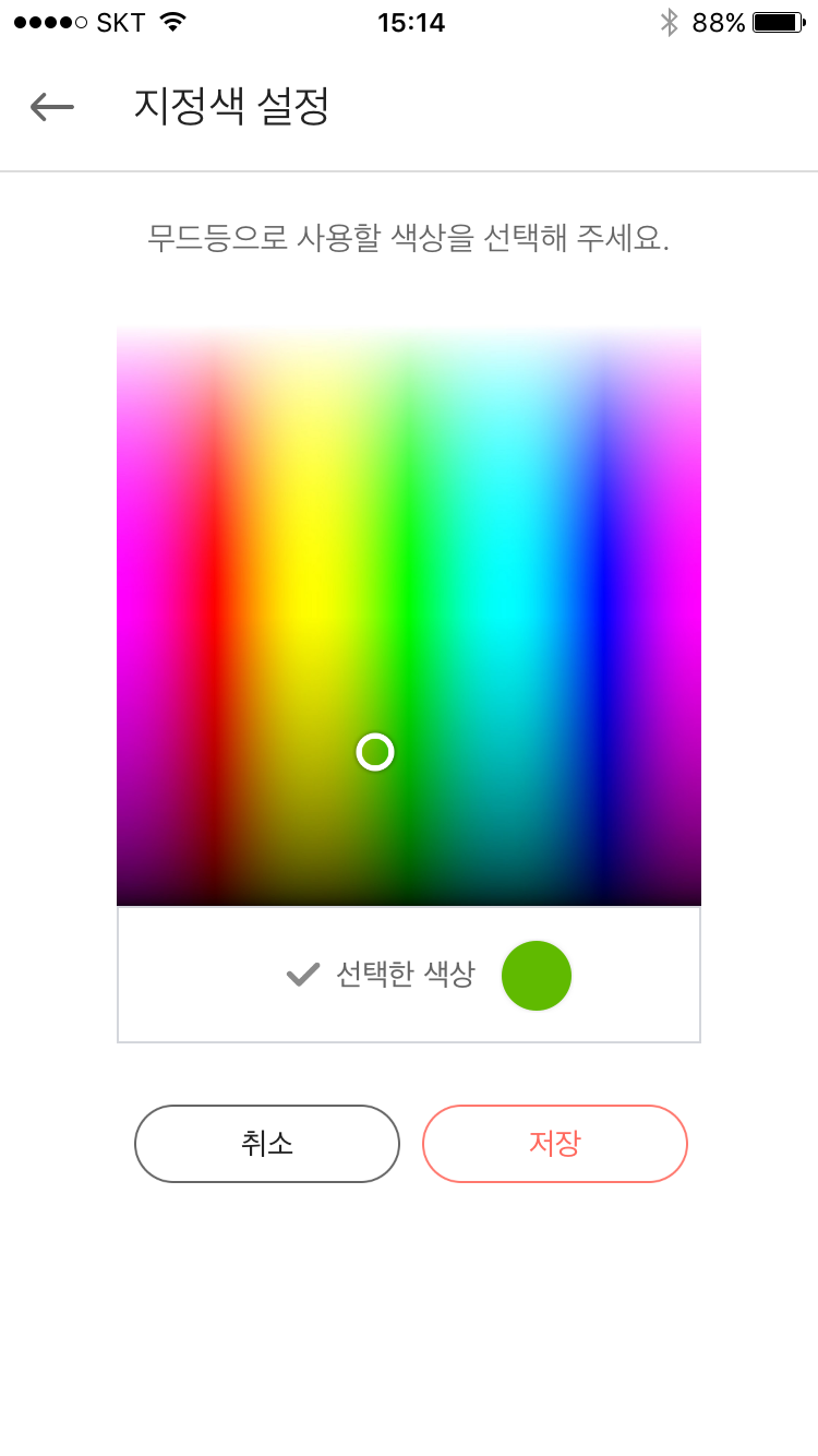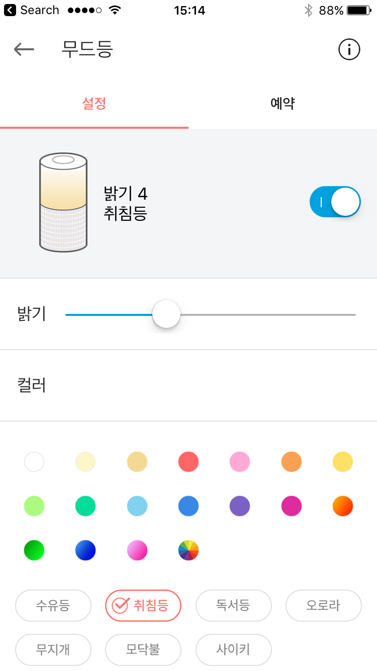 음성 명령이 곤란한 상황에서는 스마트폰에 설치하는 NUGU 앱을 사용해, 무드등 메뉴로 들어가면 조명 색상과 밝기, 알람 설정 등의 기능을 선택할 수 있다.