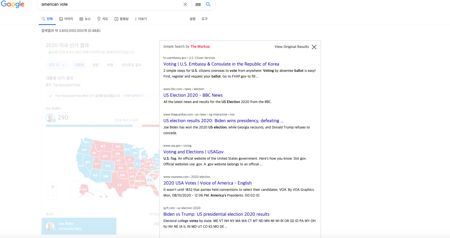 단순 검색 확장프로그램을 크롬이나 파이어폭스에 설치하고 구글이나 빙에서 검색하면, 본래 검색화면에 '단순 검색창'이 별도로 열리면서 결과를 보여준다(위). 단순 검색 결과 창을 닫으면, 원래 검색 서비스가 제공하는 결과를 볼 수 있다(아래).