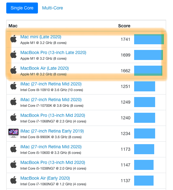 애플이 공개한 '애플 M1 칩'에 대한 긱벤치(Geekbench) 성능 평가 결과가 공개됐다. 2020년 11월 16일 23시(한국 시각) 기준으로, 애플 M1 칩을 탑재한 신형 맥 미니(2020 Late))가 싱글 코어 테스트에서 1위에 올라있다. 8개의 코어를 가진 3.2GHz의 애플 M1 칩을 장착한 맥 미니의 긱벤치 점수는 1,741점으로, 인텔 프로세서를 탑재한 맥 시리즈를 제치고 가장 빠른 것으로 되어 있다.
