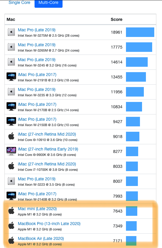 멀티코어 테스트에서 최상위권은 모두 인텔 제온 프로세서를 탑재한 제품들이고, 그 뒤를 인텔 코어 i9과 i7 제품이 일부 따르고 있다. 8코어 이상의 인텔 제온을 탑재한 맥 프로와 아이맥 프로, 역시 8코어 이상의 인텔 i7과 i9을 탑재한 일부 맥프로와 아이맥 모델이, 이번에 선보인 애플 M1 칩을 내장한 모델보다 점수가 높았다.