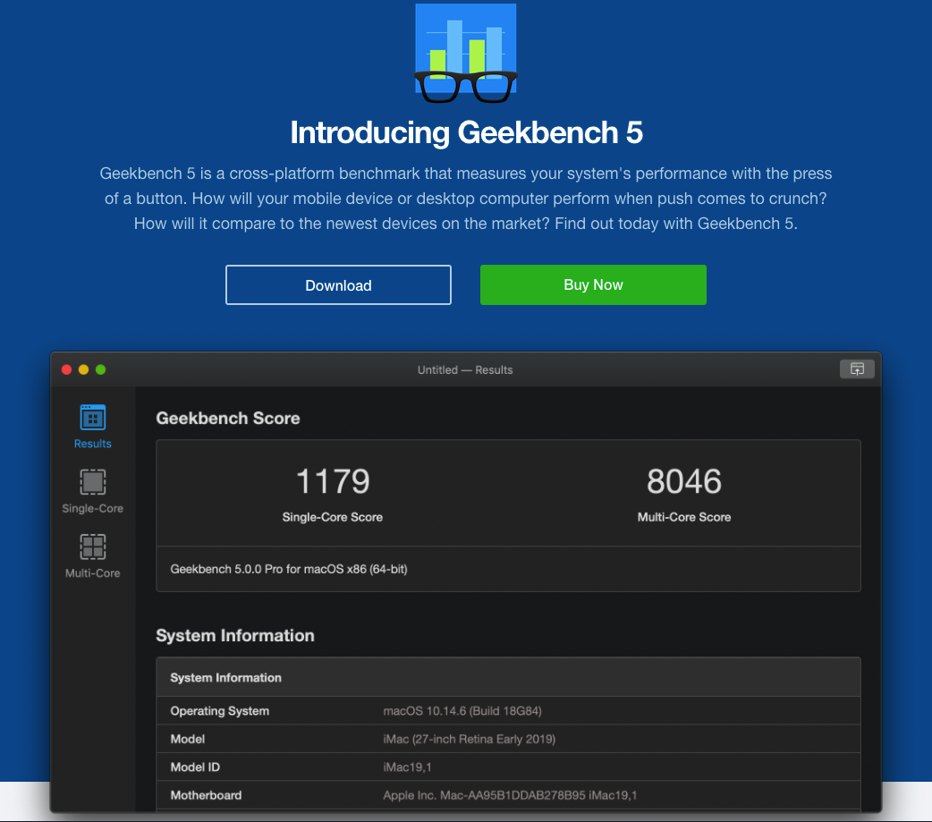 참고로 긱벤치는 실제 응용프로그램을 시뮬레이션하는 방법으로 프로세서 성능을 평가하고, 윈도뿐만 아니라 맥OS, 리눅스, 안드로이드, iOS에서 사용할 수 있는 크로스 플랫폼 벤치마크 프로그램이다. 현재는 긱벤치 5를 이용해 벤치마크를 수행하며, 누구나 홈페이지에서 긱벤치 5 평가판(tryout)을 다운로드받아 설치한 후 자신의 시스템에 대한 벤치마크를 진행할 수 있다.