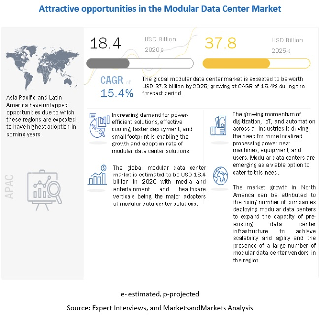 모듈형 데이터 시장 규모가 2020년 184억 달러에서 2025년 37억 달러로 성장할 전망이다. 마켓앤마켓은 예측 기간 연평균 성장률을 15.4%로 예상했다. (자료:MarketandMarket)