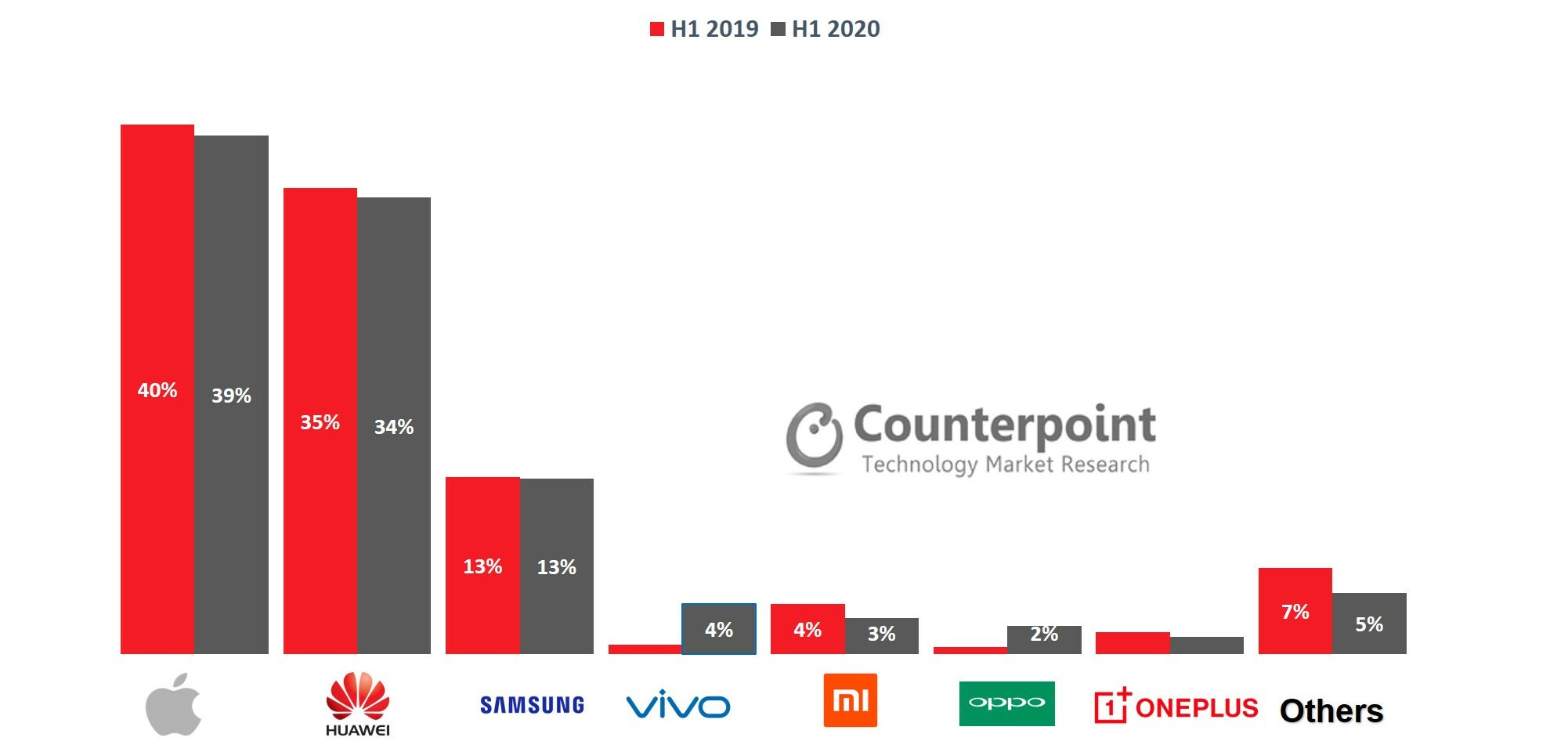 2019년과 2020년 상반기 시장 점유율을 비교한 이번 자료에 따르면, 애플이 2019년 39% 2020년에는 40%의 점유율로 선두를 달리고 있다. 화웨이는 34%(2019년)와 35%(2020년)로 2위, 삼성은 2019년 및 2020년 모두 13%로 3위에 올랐다. 그 뒤를 비보, 리얼미, 오포, 원플러스 등이 뒤따르고 있는 형국이다.