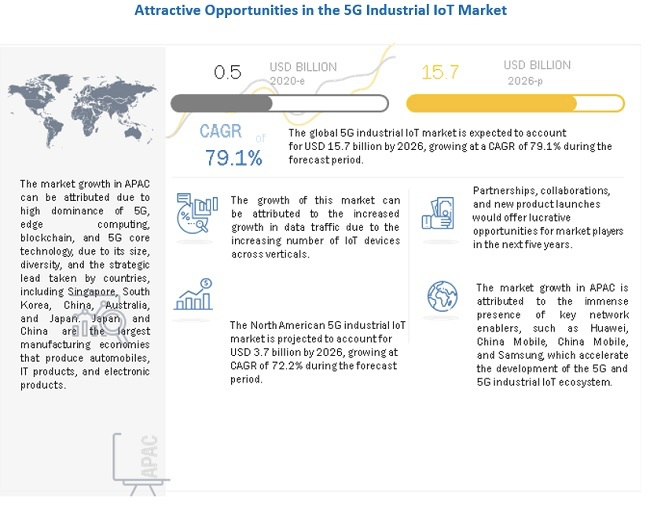 산업용 5G 사물인터넷(IoT; Intetnet of Things) 시장이 2026년까지 79.1%의 연평균 성장률을 기록하며 고속 성장할 전망이다. 2020년 5억 달러에 불과하던 시장 규모는, 2026년이 되면 157억 달러로 증가할 것으로 예측됐다. 성장 요인으로는 제조업 전반에 걸쳐 IoT 장치 수와 트래픽 증가, 제조업에서 높은 신뢰성과 저 지연 네트워크 수요 증가, 중요 장비에 대한 예방 유지 보수 필요성 증가 등이 꼽혔다.