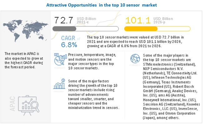 일상생활부터 다양한 산업 현장에 이르기까지 다양한 곳에서 센서들이 활용되고 있다. 그중에서 압력, 온도, 이미지, 동작, 지문, 레벨(Level), 가스, 자기장, 위치, 빛을 감지하는 10가지 센서는 센서 시장을 이끄는 선두그룹이라 할 수 있다. 이들 10개의 센서가 센서 시장을 주도하며 성장하고 있는 가운데 2026년까지 6.8%의 연평균 성장률을 기록할 전망이다.