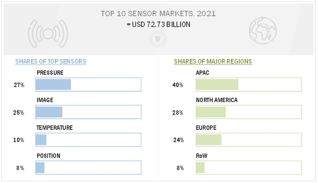 마켓앤마켓의 '2026년까지 상위 10개 센서 시장 예측' 보고서에 따르면, 2026년까지 상위 10개 센서 시장 규모가 1,011억 달러로 성장할 전망이다(위). 2021년 센서 시장 규모는 약 727억 달러로 예측했으며, 압력, 이미지, 온도 센서 순으로 수요가 많은 것으로 조사됐다(아래). (자료 : MarketandMarket)