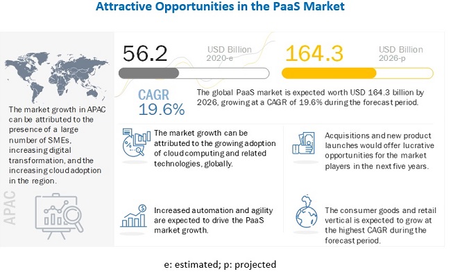 서비스로의 플랫폼(PaaS ; Platform as a Service) 시장 규모가 2020년부터 2026년까지 연평균 19.6%를 기록하며 성장할 전망이다. 2020년 562억 달러였던 시장 규모는 2026년에 1,643억 달러로 증가할 것으로 추정된다. 애플리케이션 개발 비용을 줄이려는 노력과 시장 출시 시간을 단축하려는 필요성의 증가가 시장 성장을 이끄는 요인으로 지목됐다.