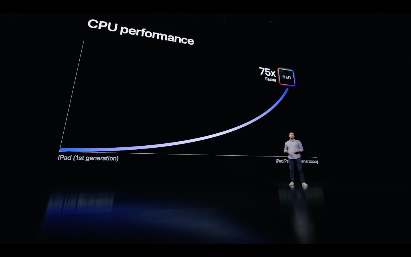 M1 칩을 탑재한 아이패드 프로는 이전 모델인 4세대 아이패드 프로에 내장한 A12Z 바이오닉(Bionic)보다 최대 50% 더 빠른 CPU 성능을 제공한다. GPU 성능도 최대 40% 향상됐다는 것이 애플의 설명이다. 이를 1세대 아이패드와 비교하면 CPU는 75배 빨라지고, 그래픽 처리 능력은 1,500배 향상된 것이다.