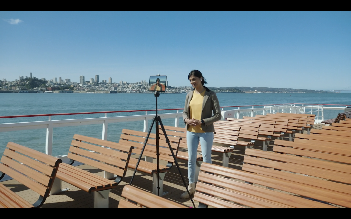 특히 센터 스테이지 기능은 울트라 와이드 카메라와 인공 지능 기술을 결합해, 화상 통화와 회의하는 방식을 한 단계 진화시켰다. 화상 회의를 하면서 카메라 앞에 꼼짝없이 앉아 있을 필요가 없어진 것이다. 센터 스테이지는 피사체의 움직임을 자동으로 추적하면서, 카메라가 사람을 중심으로 자동으로 화면을 중앙으로 맞춰준다. 다른 사람이 화각에 들어오면 시야각을 넓히고, 나가면 통화하는 사람을 줌으로 잡아 확대한다. 물론 전면 카메라는 트루뎁스(TrueDepth) 카메라와 연동해 페이스 아이디(Face ID)를 통한 잠금 해제 역할도 수행한다.