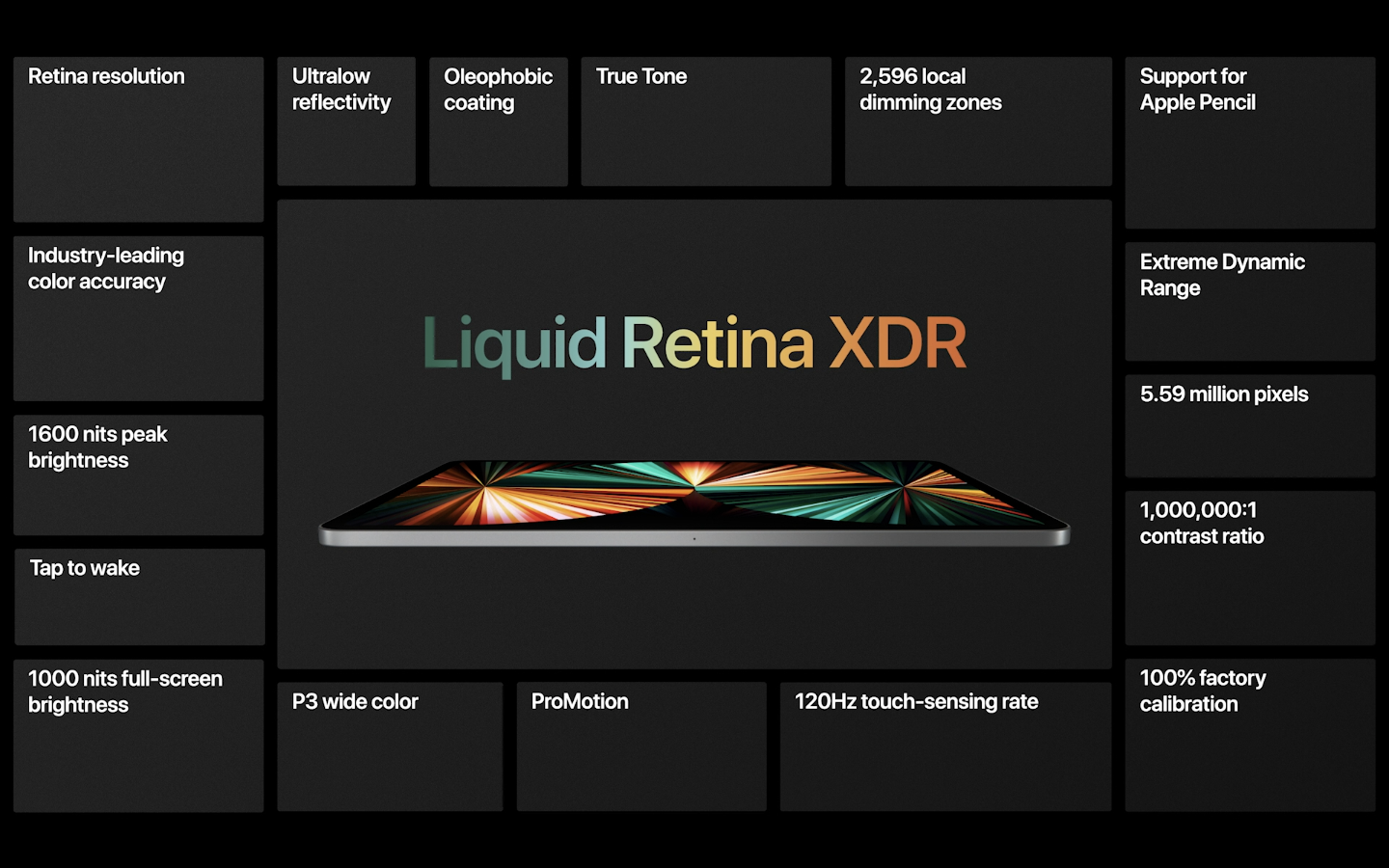 5세대 12.9인치 아이패드 프로는 디스플레이 부문에서도 새로운 장을 연 제품으로 평가받을 만하다. 미니 LED 방식의 리퀴드 레티나 XDR(Liquid Retina XDR)을 채용해, 휴대 장치에서의 디스플레이를 한 단계 진화시키는 데 성공했다. 100만:1의 명암비를 지원하는 '괴물' 같은 리퀴드 레티나 XDR 디스플레이(Liquid Retina XDR Display)는 그 자체만으로도 존재감이 달라질 것으로 기대된다.