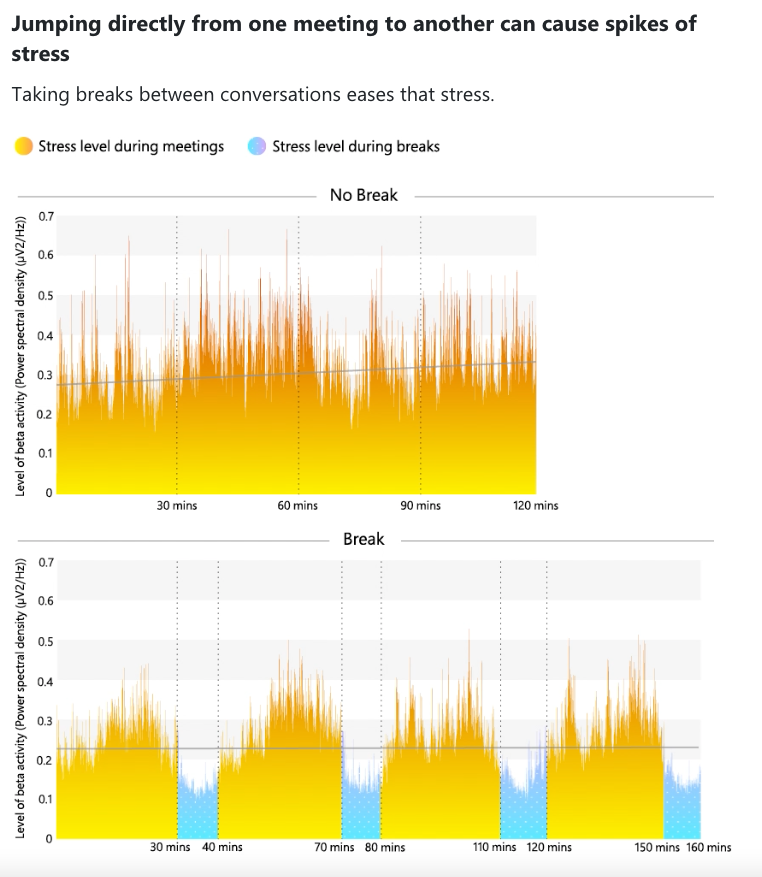 연속되는 화상 회의 사이에 휴식 시간이 있으면 스트레스 수준이 낮은 상태로 유지되지만, 휴식이 없으면 스트레스가 축적되는 것을 뇌파 분석 분석을 통해 확인했다. (자료:Microsoft, 일러스트레이션 : Brown Bird Design)