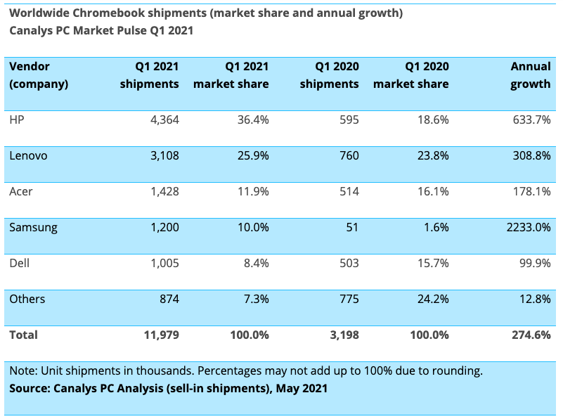 2019년 1분기부터 2021년 1분기까지 태블릿을 포함한 전 세계 PC 출하량을 보면, 크롬북이 275%의 높은 성장률을 기록한 것으로 나타났다. 노트북은 62%, 태블릿은 52% 성장했으며 데스크톱은 4%의 마이너스 성장을 기록했다(위). 2021년 크롬북 시장은 시장 점유율 10%로 4위를 기록한 삼성이 2,233%로 가장 높았고, 시장 점유율 1위인 HP는 36.4%의 시장 점유율과 633.7%의 연간 성장률을 달성했다(아래). (자료 : Canalys PC Analysis (sell-in shipments), May 2021)