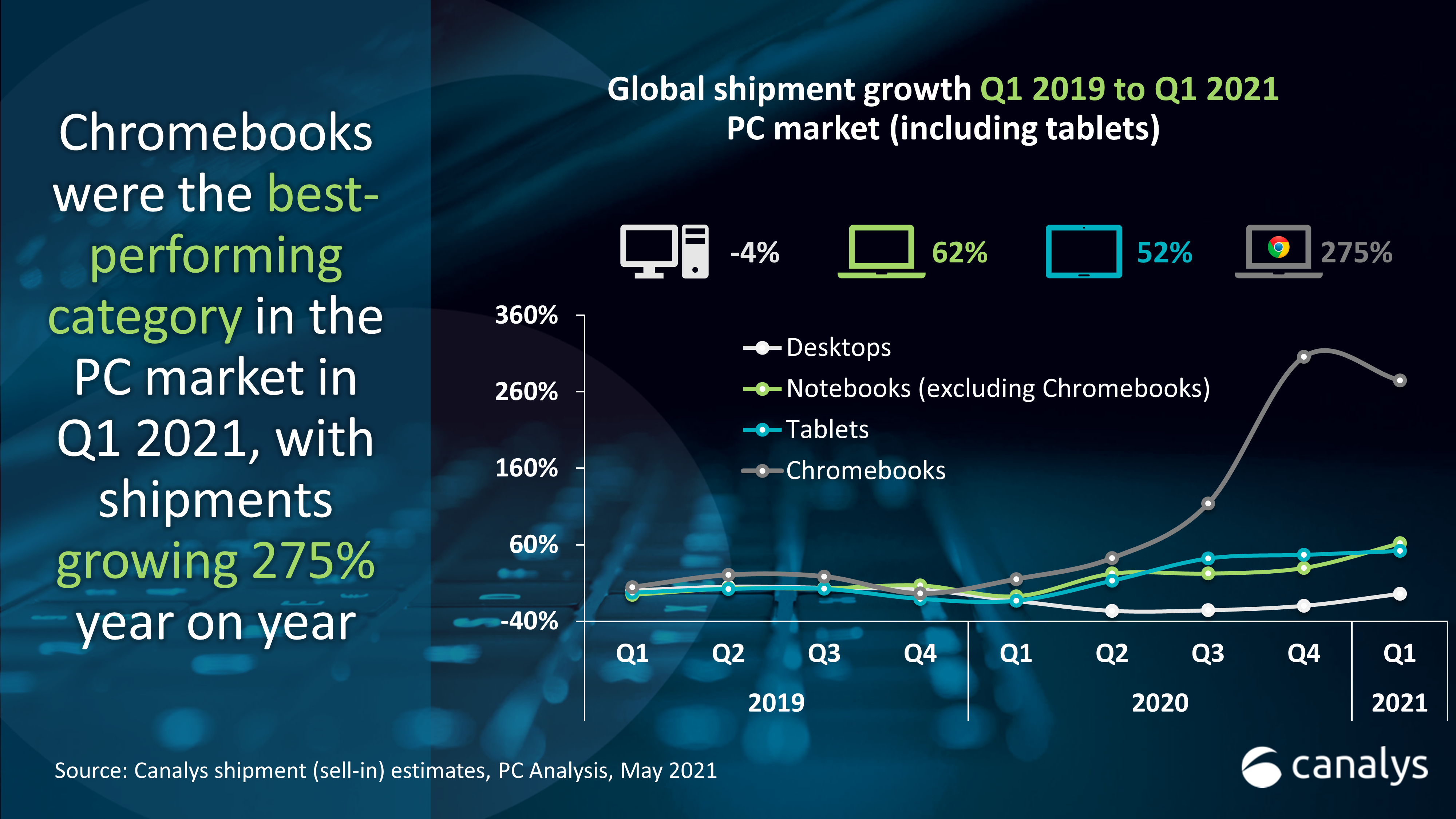 2019년 1분기부터 2021년 1분기까지 태블릿을 포함한 전 세계 PC 출하량을 보면, 크롬북이 275%의 높은 성장률을 기록한 것으로 나타났다. 노트북은 62%, 태블릿은 52% 성장했으며 데스크톱은 4%의 마이너스 성장을 기록했다(위). 2021년 크롬북 시장은 시장 점유율 10%로 4위를 기록한 삼성이 2,233%로 가장 높았고, 시장 점유율 1위인 HP는 36.4%의 시장 점유율과 633.7%의 연간 성장률을 달성했다(아래). (자료 : Canalys PC Analysis (sell-in shipments), May 2021)