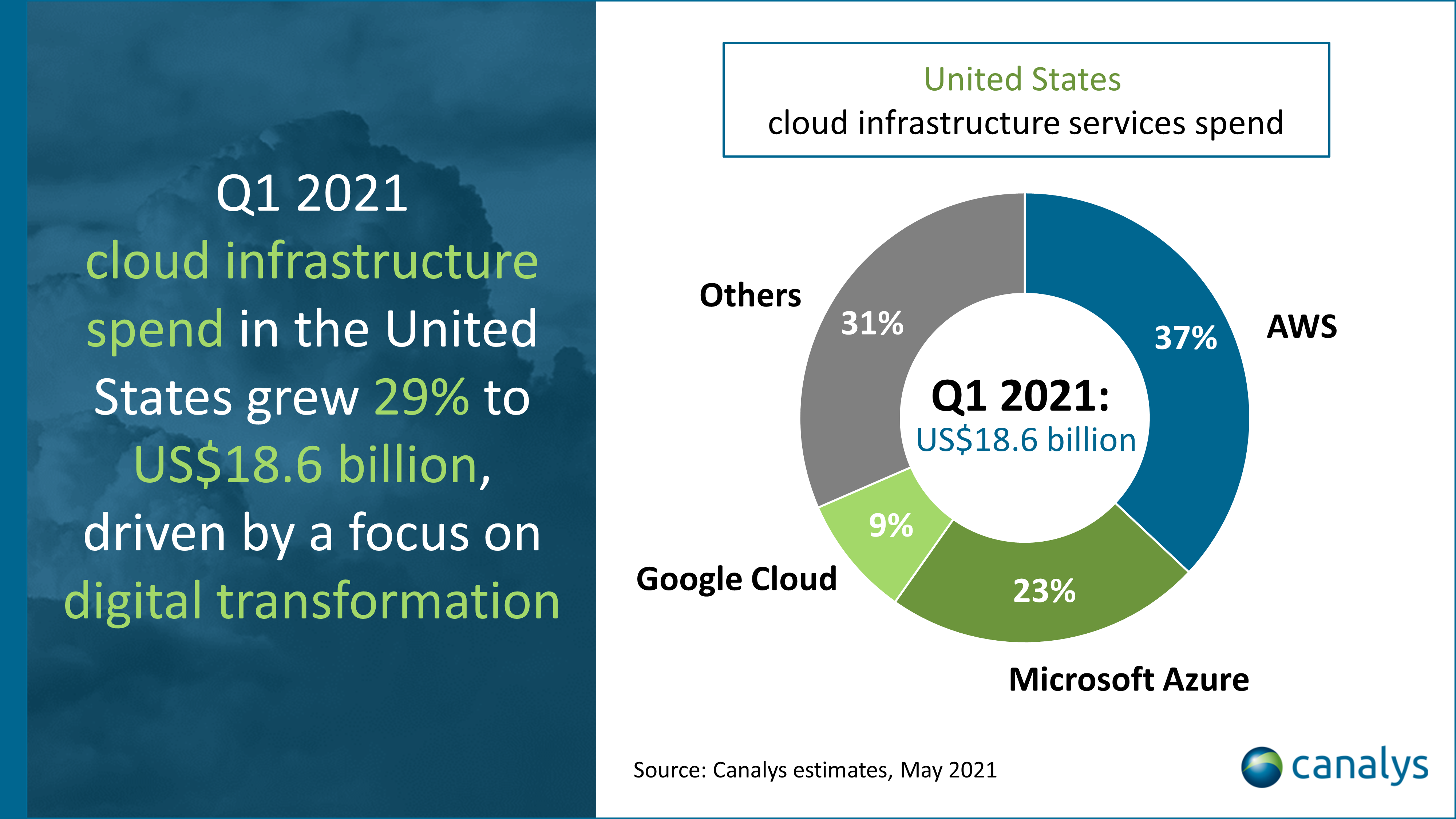 카날리스가 '2021년 1분기 미국 클라우드 인프라스트럭처 지출(US cloud infrastructure service spend Q1 2021)' 보고서를 발표했다. 코로나19(COVID-19)로 인한 경기 침체가 어느 정도 회복되는 양상을 보이고, 일부 지연되었던 프로젝트가 다시 시작되면서 클라우드 인프라에 대한 투자가 증가한 것이 성장 동력으로 작용했다고 분석했다.