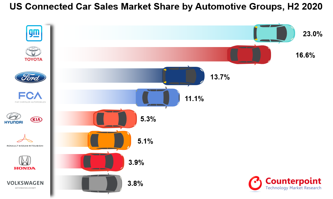 카운터포인트의 애널리스트인 파하드 시디키(Fahad Siddiqui)는 "2020년 하반기 커넥티드 카에 서비스에 대한 고객 선호도가 증가하고, GM과 포드로 구성된 선두그룹을 도요타 등이 따라잡으면서 2019년과 비교할 때 커넥티드 카 시장이 2% 성장했다. 내비게이션에서부터 차량 진단에 이르기까지 커넥티드 카가 제공하는 다양한 서비스가, 고객들의 구매를 이끌고 있다"고 밝혔다.
