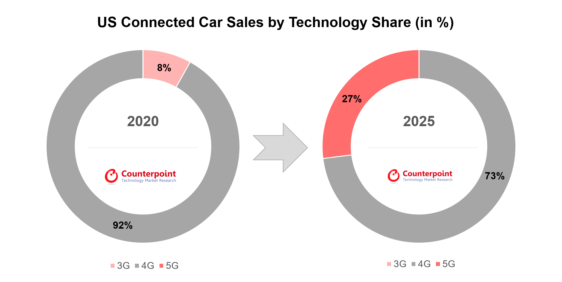 카운터포인트 리서치 부사장인 닐 샤(Neil Shah)는 "2020년에는 커넥티드 카의 92%를 4G LTE가 차지하며 엄청난 점유율을 차지했다. 5G 지원하는 커넥티드 카는 2020년에 출시되기는 했지만, 중국 시장에만 국한됐다. 미국에서는 2022년부터 BMW와 포드가 5G 통신망을 사용하는 자동차를 내놓을 것이며, 2025년이 되면 전체 커넥티드 카 시장의 27%가 5G 네트워크를 사용할 것이다"라고 전했다.