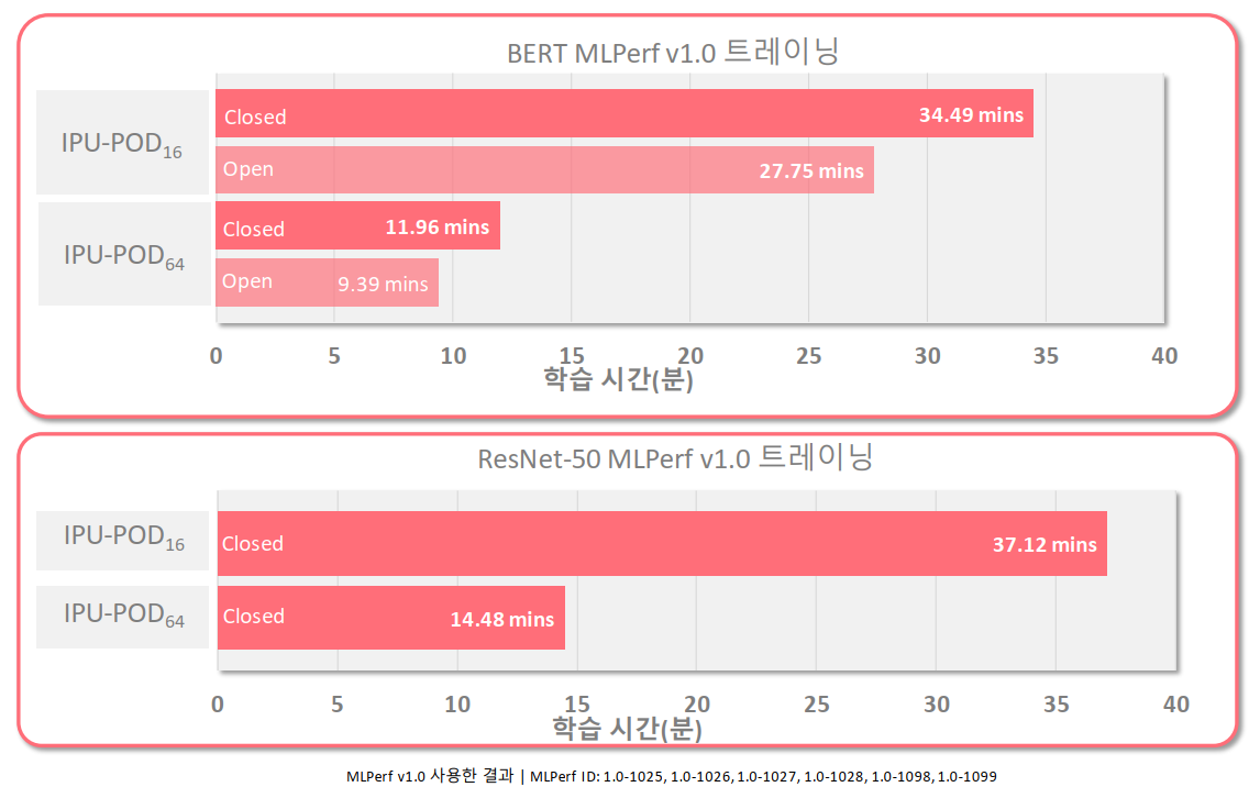 이번에 그래프코어가 공개한 MLPerf 테스트 항목은 MLPerf 트레이닝으로 자연어 처리(NLP[BERT])와 이미지 분류인 ResNet-50 항목에 대해서만 벤치마크를 진행한 결과다. 그래프코어는 이런 결과를 기준으로 IPU-POD16이, ResNet-50학습에서 경쟁사 대비 1.6배, BERT에서는 경쟁사 대비 1.3배 향상된 성능을 구현했다고 강조했다.
