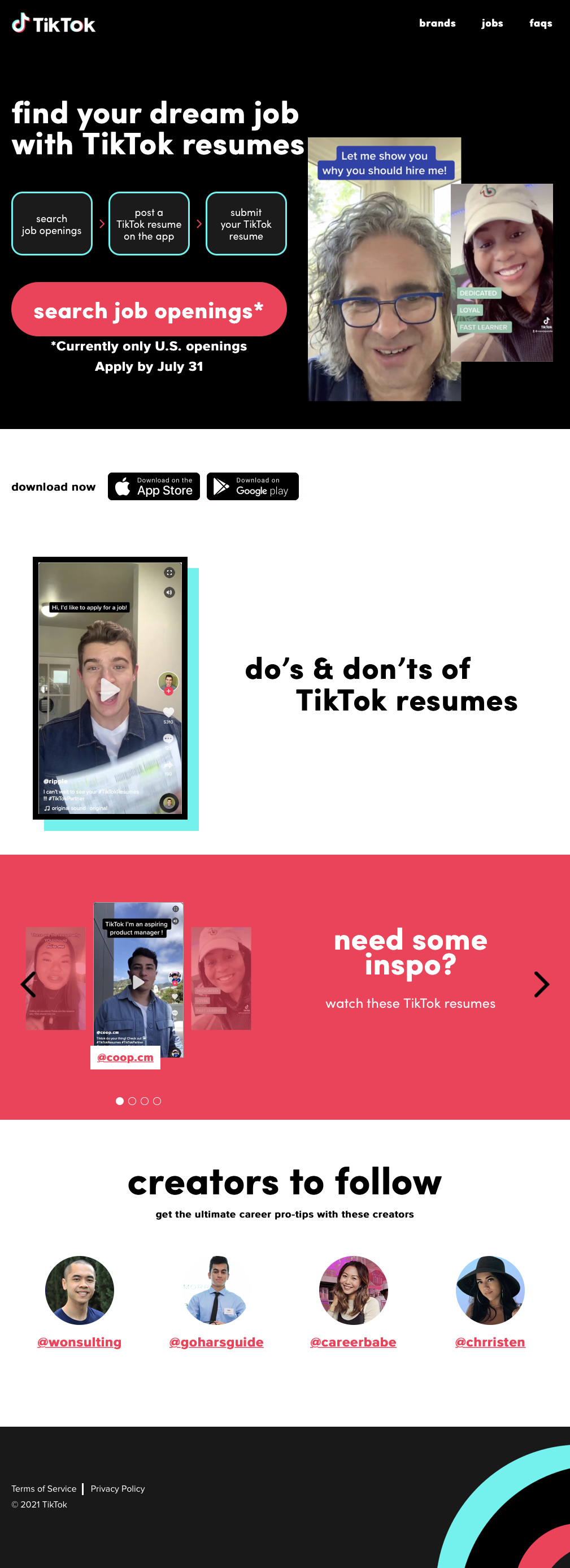 이를 위해 틱톡은 별도의 채용 정보 사이트인 틱톡레주메(tiktokresumes.com)를 오픈했다. 사이트를 방문하면 브랜드(brand), 직업(jobs), 자주 묻는 질문(faqs)로 구성된 메뉴를 만날 수 있다. 브랜드에서는 동영상 이력서 프로젝트에 참여하는 협력업체들의 목록을 확인할 수 있으며, 7월 8일 기준 34개의 업체가 이름을 올렸다.