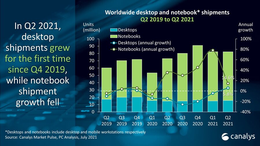 카날리스가 'PC 마켓 펄스 2021년 2분기(Canalys PC Market Pulse Q2 2021)' 보고서를 발표했다. 2021년 1분기 전 세계 PC 시장에 출하된 PC는 노트북 및 모바일 워크스테이션이 여전히 인기를 얻어, 지난해 보다 15% 증가한 6,670만대가 시장에 공급됐다. 데스크톱 및 데스크톱 워크스테이션은 6% 증가해 1,560만대가 시장에 출하됐다.
