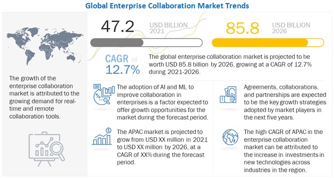 마켓앤마켓이 발표한 '엔터프라이즈 협업 시장 예측' 보고서에 따르면 기업 협업 시장 규모가 2026년까지 연평균 12.7% 성장할 전망이다. 2021년 472억 달러이던 시장 규모는 2026년에 858억 달러에 달할 것으로 예측됐다. (자료:MarketsandMarkets)
