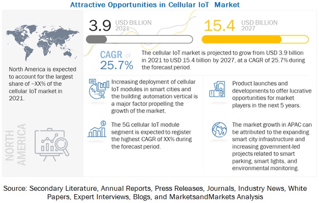 마켓앤마켓이 발표한 '2027년까지 글로벌 셀룰러 IoT 시장 전망' 보고서에 따르면, 전 세계 셀룰러 IoT 시장 규모가 2021년 39억 달러에서 2027년 154억 달러로, 연평균 25.7% 성장할 전망이다. (자료:MarketsandMarkets)