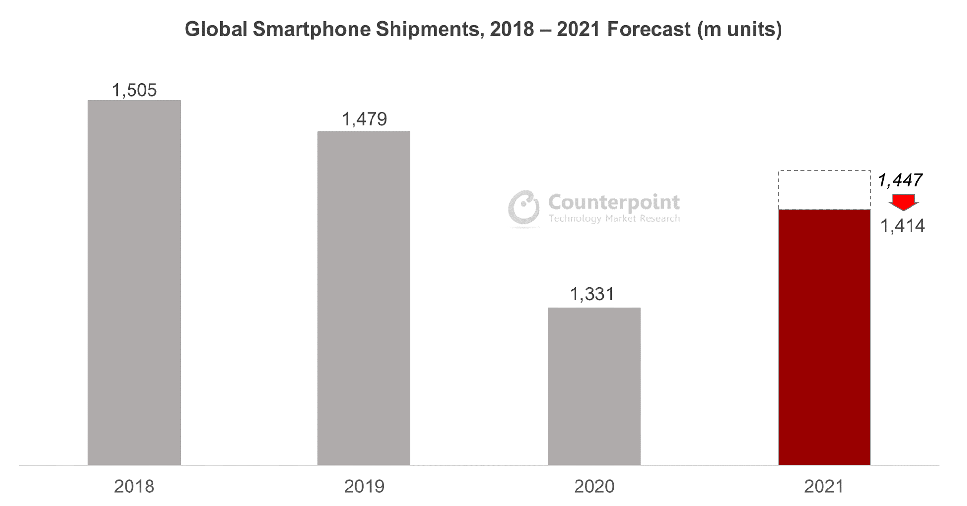 카운터포인트 리서치가 '글로벌 스마트폰 분기별 출하량 전망(Global Smartphone Quarterly Shipment Forecasts)'을 발표하고, 이전에 발표했던 2021년 스마트폰 출하량 전망을 연간 14억 4,700만 유닛에서 14억 1,414만대로 낮췄다. 이전에 발표했던 9%의 연간성장률을 6%로 하향 조정한 것이다.