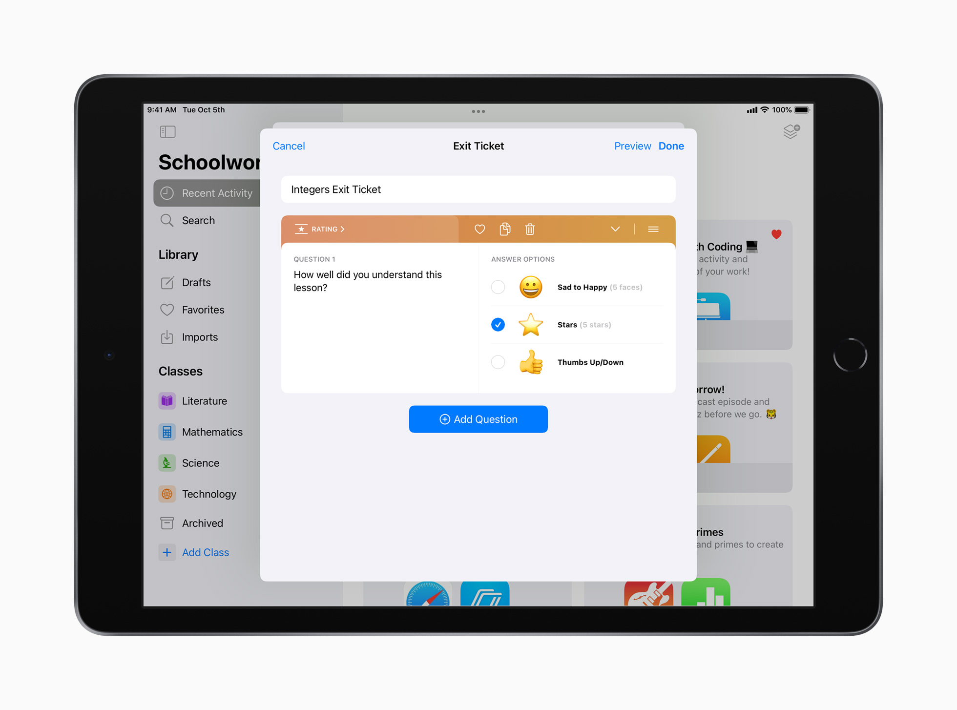 스쿨워크(Schoolwork) 앱은 교사들이 학생들의 상태를 파악하고 이해도를 평가할 수 있는 새로운 도구인 출구 티켓(Exit Tickets)을 지원해, 고사들이 학생들의 상태를 파악하고 이해도를 평가할 수 있도록 돕는다. (자료:Apple)