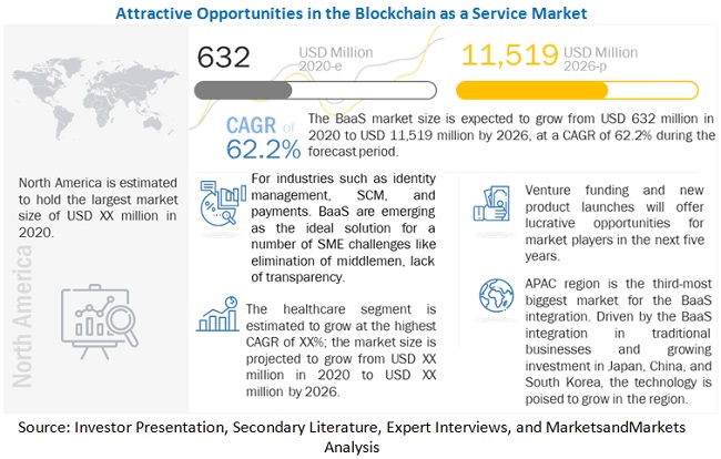 마켓앤마켓이 발표한 '2026년까지 서비스로서의 블록체인 시장 전망' 보고서에 따르면, BaaS 시장이 2026년까지 62.2%의 연간 복합 성장률(CAGR)을 기록하며 초고속 성장세를 이어갈 전망이다. (자료:MarketsandMarkets)
