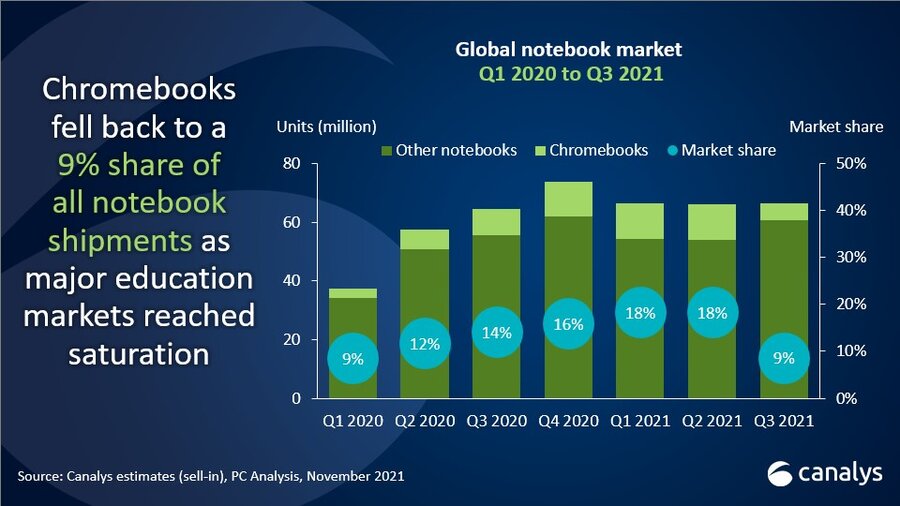 크롬북 시장은 2020년 3분기와 비교하면 37%, 2021년 2분기와 비교하면 52%가 감소하며, 가장 큰 타격을 입었다. 카날리스는 미국과 일본의 교육 시장에서의 수요가 포화 상태에 이르고, 디지털 교육 프로그램에 대한 공공 부문 자금 지원의 둔화가 원인이라고 밝혔다. 하지만 미국 교육 시장에서는 시간이 지나면서 회복될 것으로 전망했다.