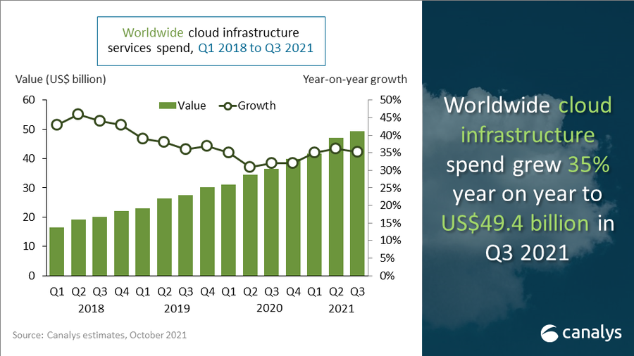 2021년 3분기 글로벌 클라우드 서비스 지출 규모가 지난해 같은 기간에 비해 35% 증가한 것으로 조사됐다. 2020년 3분기 365억 달려였던 클라우드 서비스 지출은, 올해 3분기 129억 달러가 증가하면서 494억 달러를 기록했다. 2021년 2분기와 비교하면 지출 규모가 약 24억 달러 증가했다. 코로나19(COVID-19) 펜데믹으로 급증한 클라우드 서비스 수요가 여전히 시장을 견인하고 있는 상황이다.
