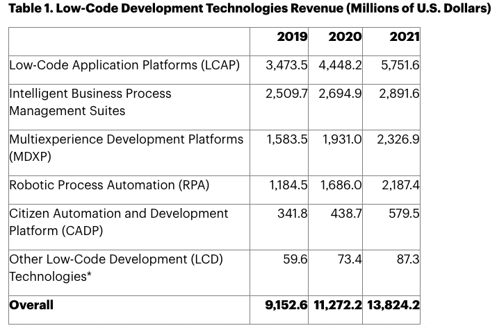 분야별 로우 코드 개발 기술 수익 규모는 로우 코드 애플리케이션 개발 플랫폼, 지능형 비즈니스 프로세스 제품 관리 제품군, 다중 경험 개발 플랫폼 순으로 규모가 크다. 2021년 전체 수익 규모는 약 138억 달러로 추정했다. (자료:Gartner)