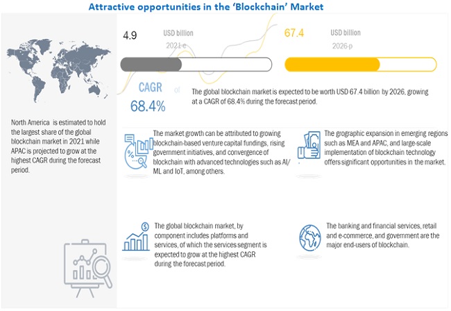 블록체인 시장이 2026년까지 연간 68.4% 성장할 전망이다. 2021년 49억 달러로 예상되는 시장 규모는 2026년에 674억 달러로 크게 증가할 것으로 예상된다. 시장 성장을 주도하는 요인으로는 블록체인 기술에 대한 투자 증가, 은행 및 사이버 보안 분야에서 블록체인 솔루션의 사용 확대, 지불 및 신원 확인 시스템에서 블록체인 기술 확산 등이 지목됐다.