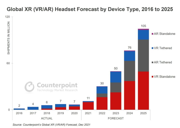 확장 현실(XR;Extended Reality) 헤드셋 출하량이 2025년까지 1억 대를 돌파하며 2021년 보다 약 10배 증가할 전망이다. 카운터포인트 리서치(Counterpoint Research)가 '글로벌 XR(AR/VR) 전망(Global XR Forecast)'을 발표하고, 2021년 약 1,100만 대에 달했던 출하량이 2025년까지 1억 500만대로 증가할 것으로 예상했다.