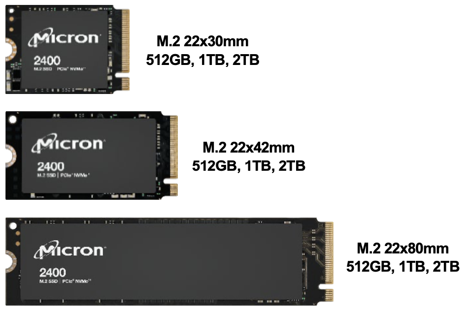 세 가지 모두 동일한 펌웨어를 탑재한 마이크론 2400 시리즈는, 크기가 각각 22x30mm, 22x42mm, 22x80mm로 모두 M.2 폼 펙터로 제공된다. 특히 22x30mm 제품은 크기를 최소화하면서 최대 2TB 용량을 저장할 수 있는 단면 SSD로 설계했다. 22x30mm 크기의 단면 SSD에 2TB라는 대용량 저장 공간을 제공할 수 있기는 만큼, 더 작고 가벼운 노트북을 제작하는 것이 가능해진다.