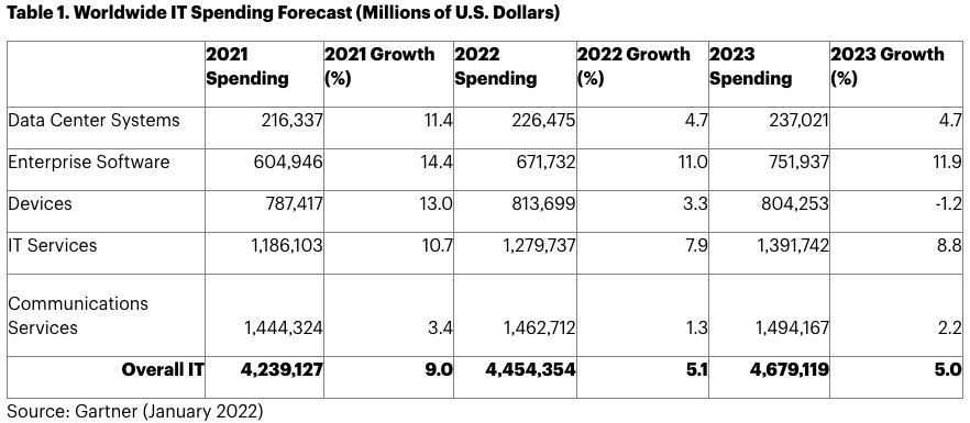 이러한 가운데 2022년 전 세계 IT 총지출 규모가 2021년 보다 5.1% 증가한 4조 4,543억 달러에 이를 것으로 가트너는 전망했다. 가트너는 전 세계 IT 지출 분야 5가지 중에서 엔터프라이즈 소프트웨어가 11%를 기록하며 1위, IT 서비스 분야가 7,9% 성장하며 2위를 달릴 것으로 예상했다. 그 뒤를 이어 데이터 센터 시스템(4.7%), 장치(3.3%), 통신 서비스(1.3%)가 성장률을 기록할 전망이다.