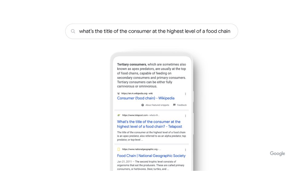 "유용한 검색 결과를 제공하기 위해 많은 노력이 필요하며, 언어 이해는 가장 중요한 검색 기술 중 하나다. 인공 지능 및 기계 학습의 발전 덕분에 구글 검색 시스템은 그 어느 때보다 인간의 언어를 더 잘 이해하고 있다. 사실, 우리가 매일 보는 검색의 15%는 완전히 새로운 것이다. 인공 지능은 상상력의 가장 바깥쪽에서도 유용한 결과를 보여주는 데 중요한 역할을 한다."