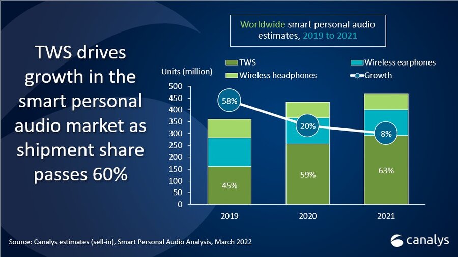카날리스(Canalys)가 '스마트 개인용 오디오(Canalys estimate (sell-in) Smart Personal Audio, March 2022)' 보고서를 발표했다. 스마트 개인용 오디오 시장에서 TWS의 출하량은 2019년 45%에서 2020년 59%로 증가했고, 2021년에는 63%를 기록하며 약진 중이다. TWS의 향상된 가용성과 접근성이 출하량 증가로 이어지고 있다는 것이 카날리스의 분석이다.