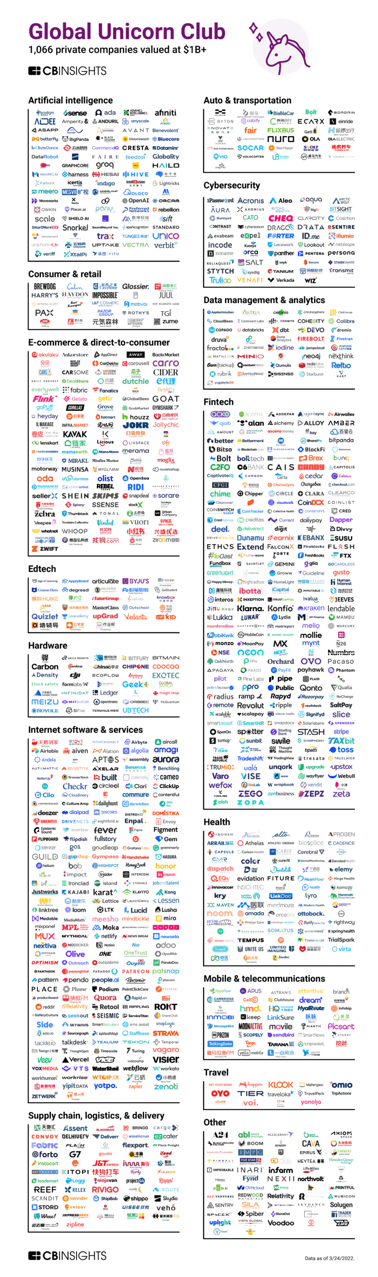 CB인사이츠(CB Insights) 이렇게 집계한 유니콘 기업을 인공 지능, 소비자 및 소매, 이커머스와 DTC(Direct to Consumer), 에드테크(Edtech), 하드웨어, 인터넷 소프트웨어와 서비스, 공급망과 물류 및 배송, 자동차 및 운송, 사이버 보안, 데이터 관리 및 분석, 핀테크, 건강, 모바일 및 통신, 여행, 기타의 15개 범주로 구분했다. 그리고 이를 한 장의 인포그래픽으로 만들어 공개했다.