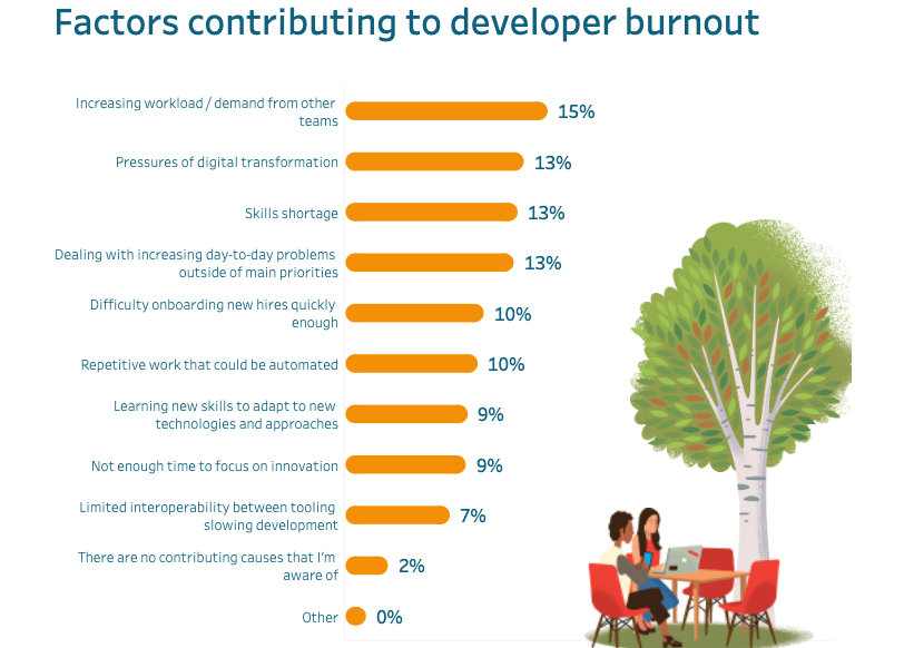 이렇게 필요한 인력을 유지하거나 채용하는 것이 힘들어진 이유는, 개발자들이 디지털 혁신과 반복적인 작업에 대한 압박감이 크기 때문이다. 다른 팀의 워크로드 및 수요 증가, 디지털 혁신 압박, 새로운 기술 및 접근 방식에 적응하기 위한 학습 기술 습득이 개발자들에게 가장 큰 부담을 느끼게 하는 세 가지 요소로 지목됐다.
