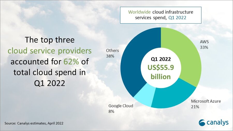 카날리스가 '2022년 분기 전 세계 클라우드 인프라스트럭처 서비스 지출(Worldwide cloud infrastructure service spend, Q1 2022)' 보고서를 발표했다. 전체 지출의 33%를 차지한 AWS(Amazon Web Services)가 여전히 시장 1위를 지키고 있고, 2위 마이크로소프트 애저(Microsoft Azure)와 구글 클라우드는 각각 21%와 8%의 시장 점유율을 기록했다.