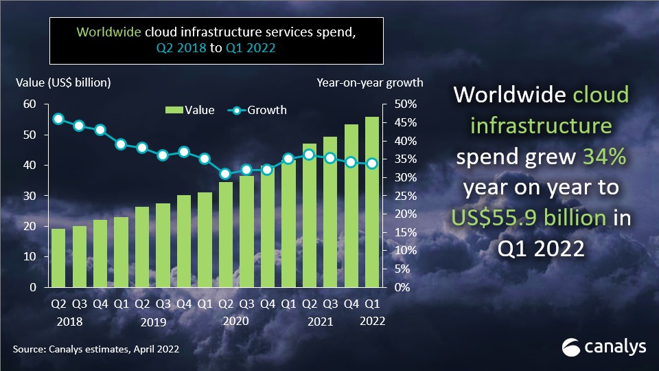 "2022년 1분기 전 세계 클라우드 인프라 서비스 지출이 559억 달러에 달하며 34%의 연간 성장률 기록했다. 이전 분기와 비교하면 20억 달러 이상, 2021년 1분기와 비교하면 140억 달러 이상이 증가한 것으로 추정된다. 상위 3개 클라우드 서비스 제공업체의 클라우드 인프라 서비스 도입 및 규모가 증가하면서, 전체적으로 전년 대비 42% 성장했으며 이는 전 세계 고객 지출의 62%에 해당한다."