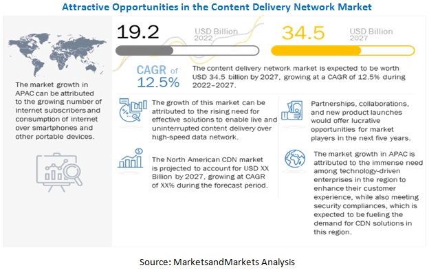 전 세계 CDN(Content Delivery Network) 시장 규모가 2022년 192억 달러에서 2027년 345억 달러로 성장하며, 연간 12.5%의 성장률을 기록할 전망이다. 웹 개체, 다운로드 개체, 응용 프로그램, 실시간 스트리밍 데이터, 주문형 스트리밍 미디어 등 다양한 분야에서, 고가용성 및 고성능으로 고품질의 콘텐츠를 제공하려는 수요 증가가 시장 성장을 이끌 것으로 예상된다.