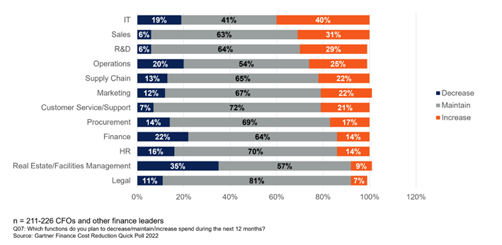 우선 지출 규모가 증가할 것으로 전망한 부문은 40%가 응답한 IT가 가장 높았다. 이어서 영업(31%), 연구 개발(29%), 운영(25%), 공급망(22%), 마케팅(22%), 고객 서비스와 지원(21%), 조달(17%), 재무(14%), 인사(14%), 부동산 및 시설 관리(9%), 법무(7%)가 뒤를 이었다. IT에 대한 지출 규모 증가는 2022년 5월 CFO의 45%가 엔터프라이즈 디지털 이니셔티브를 확장할 계획이라고 응답한 설문 결과와 크게 다르지 않다.