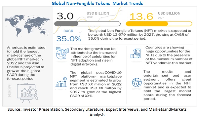 보고서는 "업계 전문가에 따르면 코로나19 팬데믹 이후 디지털 시장의 기하급수적인 증가가 NFT의 채택과 성장에 가장 크게 기여했다. 이러한 플랫폼은 매력적인 제안과 예술을 표현하는 새롭고 유익한 방법으로 온라인 쇼핑객을 끌어들였다. 미술 수집가들은 또한 대부분의 갤러리에서 제공하는 NFT의 정적인 온라인 경매 시장을 선호했다"며 팬데믹 이후 NFT 시장이 빠르게 성장하고 있다고 시장 상황을 전했다.